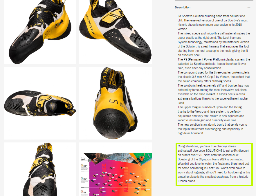 Here are this year's riddles: The first clue was the shoes used by the Olympic athlete Jakob Schubert: naturally, they are the Solutions by La Sportiva! On the Solution product page, at the bottom of the description, you found the second discount code and the second riddle: