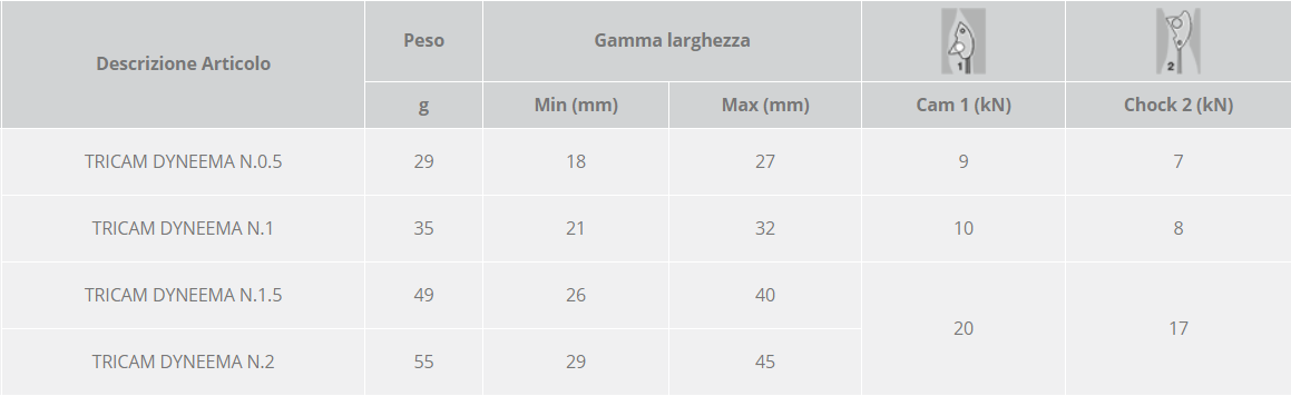 CAMP Set Tricam Dyneema includes 4 climbing nuts of the most commonly used sizes (0.5, 1.0, 1.5, 2.0) with Dyneema webbing!