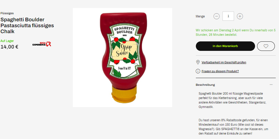 Es handelt sich um das unverwechselbare Flüssigmagnesia von Spaghetti Boulder: Sie können sicher sein, dass Sie es nicht mit anderen verwechseln werden, wenn Sie in der Kletterhalle klettern!