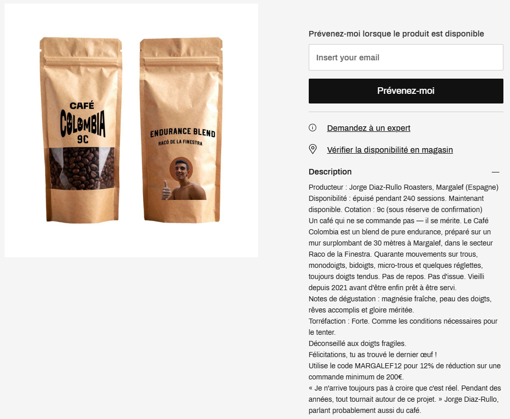 Le dernier indice parlait d'un grimpeur qui avait mis 240 sessions pour commander sa boisson chaude préférée. La solution était cachée dans le menu de notre site : une fausse page produit dédiée au Café Colombia, le 9c de Jorge Diaz-Rullo à Margalef.