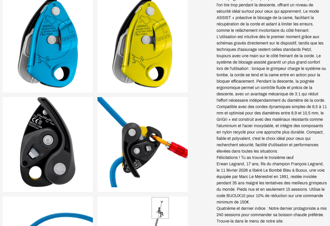 Le troisième indice décrivait un jeune de 17 ans qui avait libéré pieds nus une voie restée inviolée pendant 35 ans, et vous invitait à penser à l'assureur : avait-il eu l'occasion d'essayer le nouveau système d'assurage d'une marque bien connue ? La solution était le Petzl Grigri+. Le protagoniste était Erwan Legrand, fils de François Legrand, qui le 11 février 2026 a libéré Le Bombé Bleu à Buoux en seulement 15 sessions.