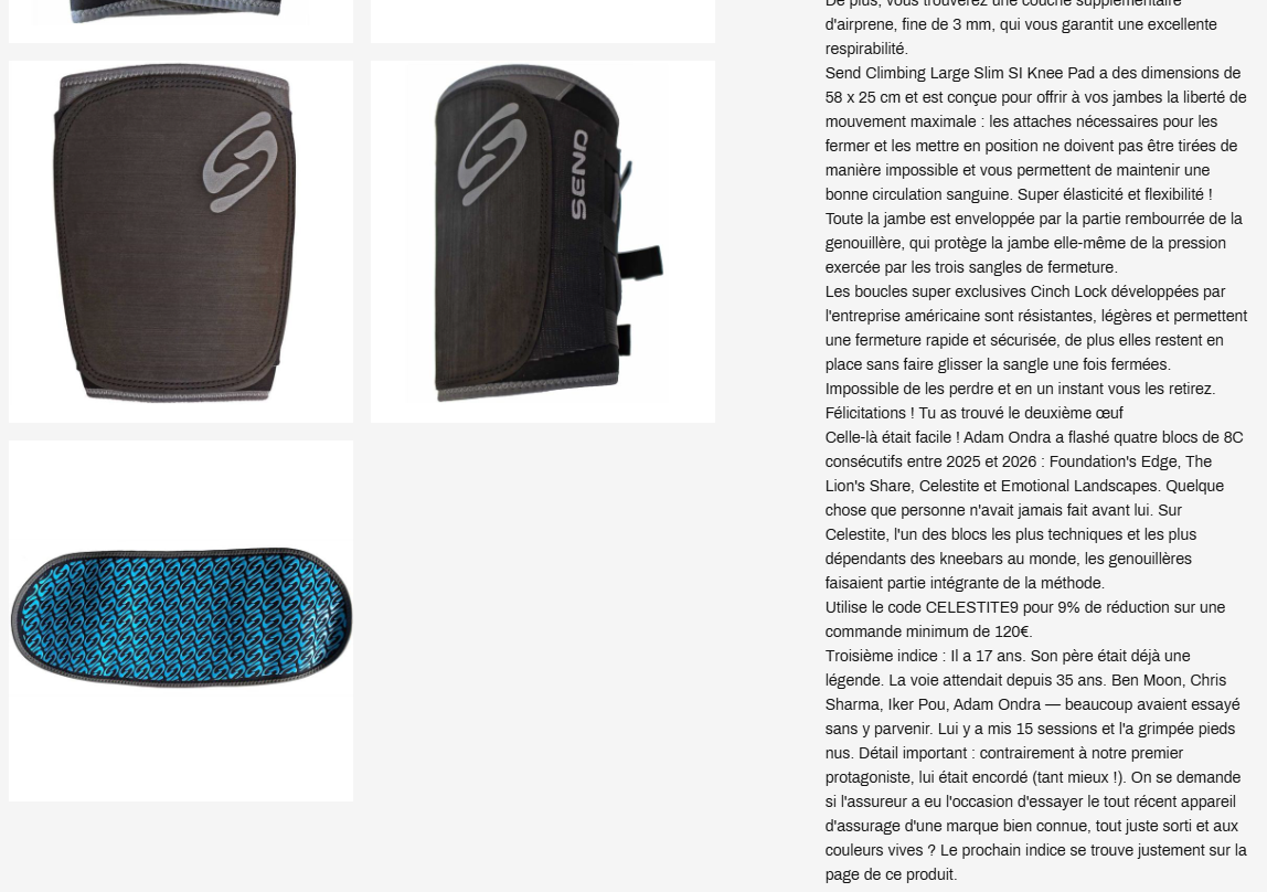 Sur la page des TC Pro se cachait le deuxième indice : un grimpeur qui avait flashé quatre blocs de 8C consécutifs en portant deux genouillères différentes. La solution était la Send Large Slim knee pad, celle qu'Adam Ondra portait à la jambe droite sur Celestite, l'un des blocs les plus techniques et les plus dépendants du kneebar au monde.