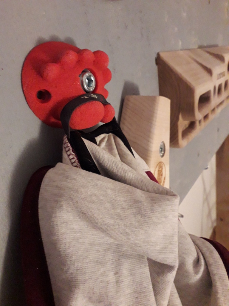 6- Appendiabiti. Molto più semplice del precedente consiglio, ti permette anche in questo caso di riciclare anche un pannello ragnato del muro boulder che non usi più: basta dargli una bella dipinta e sfruttare i buchi già presenti per fissare delle prese grosse. Per tornare in tema di bimbi, puoi usare le prese a forma di lettere o animali per creare un piccolo appendiabiti adatto alla loro cameretta e per tornare in tema di climber puoi usarli come appendioggetti vari nella stanza del trave, in cantina o in garage.