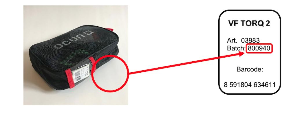 Qui sotto puoi vedere come controllare se il tuo set Torq 2 fa parte della batch in questione. Se dovesse rientrare nei parametri contatta immediatamente via mail Ocun a [email protected].