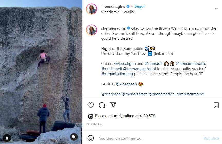 Anche Nina Williams è ancora attiva e fortissima nella sua specialità, gli highball. Nel suo ultimo video possiamo vedere, tutta col fiato sospeso, la salita del Brown Wall, un boulder pazzesco aperto da un altro specialista dei boulder “ad alto rischio”, Kevin Jorgeson. Precisione, sangue freddo e non guardare verso i crash pad sono gli elementi richiesti per uscire indenni dalle vertiginose altezze di questo masso.