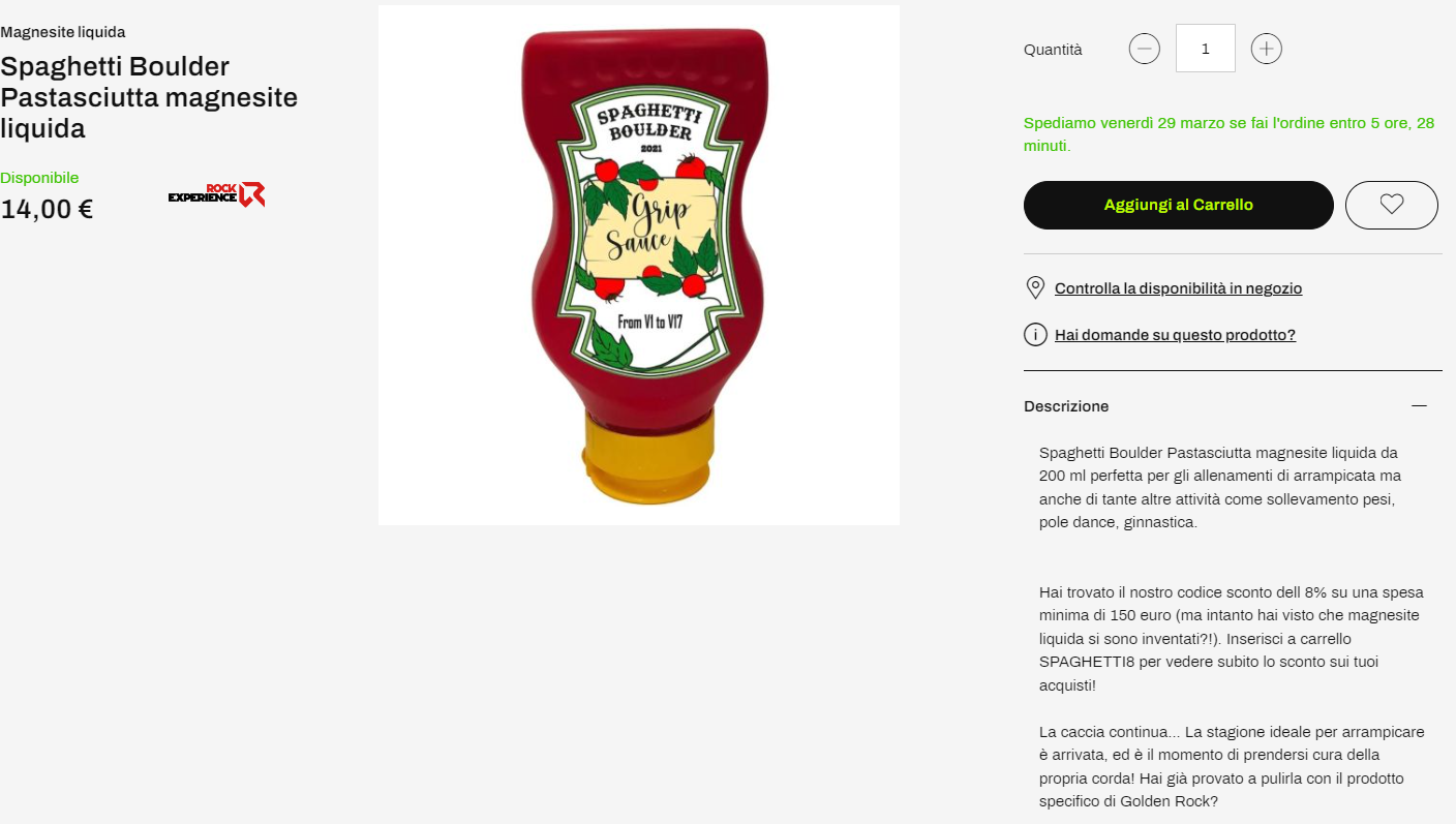 È l’inconfondibile magnesite liquida di Spaghetti Boulder: puoi essere sicuro che questa non la confonderai con le altre quando arrampicherai in palestra!