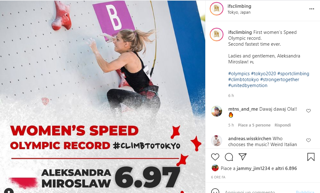 E succede proprio questo: nella Speed Aleksandra Miroslav sigla il miglior tempo femminile olimpico con 6’97 e vola in altissimo al primo posto. Difficile per lei non essere una delle otto atleti più forti che vedremo nella gara finale di venerdì. Come lei vanno più veloci di tutte le altre Anouck Jaubert e Yiling Song, seguite da Miho Nonaka, che aveva fatto già delle belle perfomance in Coppa del Mondo e lulia Kaplina, che forse sperava in qualche punto in più. Janja Garnbret si ferma al quattordicesimo posto con 9’44, anche se sappiamo che può fare molto di più; diciannovesimo posto per Laura Rogora, che cade al secondo round.