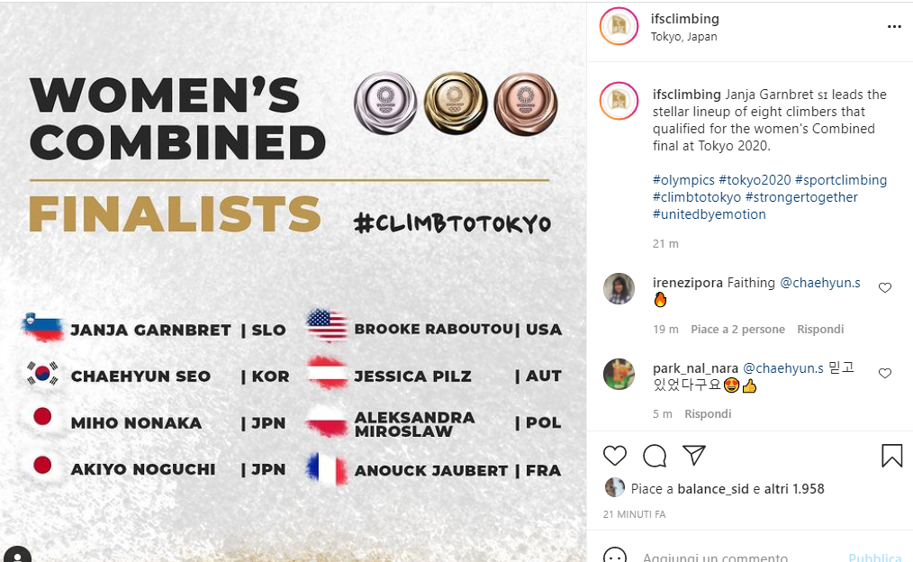 Passano in finale Janja Garnbret, che conclude comunque al primo posto della classifica combinata, la straordinaria Chaehyun Seo, Miho Nonaka, Akiyo Noguchi, Brooke Raboutou, Jessica Pilz, Aleksandra Miroslaw ed Anouck Jaubert. E venerdì si comincia da capo con le tre prove che porteranno all’assegnazione delle medaglie!