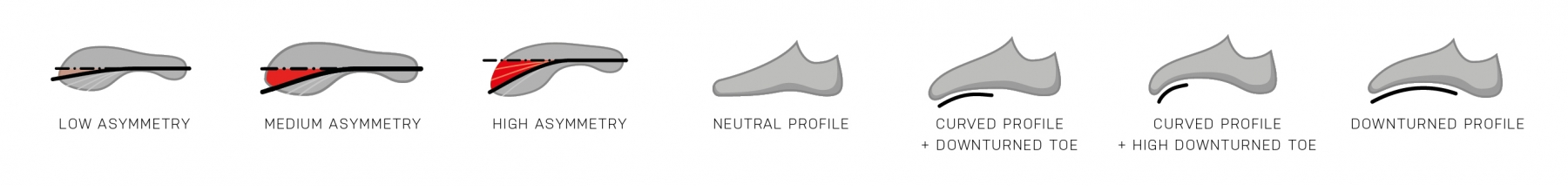 La curva della parte anteriore della scarpetta ne definisce l’asimmetria, che non coincide con l’arcuatura o incurvatura della suola. Questa caratteristica può essere poco o molto pronunciata ed influisce sulla tensione finale della scarpa, ovvero su quanto la struttura della scarpetta ci aiuta ad imporre la corretta forza sulla punta.