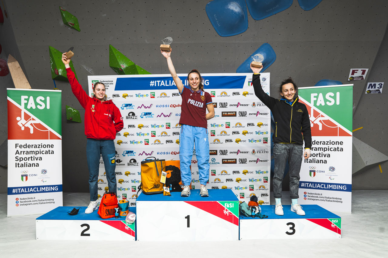 Ottima anche la gara di Irina Daziano, ormai immancabile nelle Finali di Boulder, che conquista un sudatissimo terzo posto grazie ad una zona in più rispetto a tutte le altre, agguantata sul terzo boulder. Come sempre assolutamente oltre le righe Camilla Moroni e di suoi quattro top in sette tentativi.
