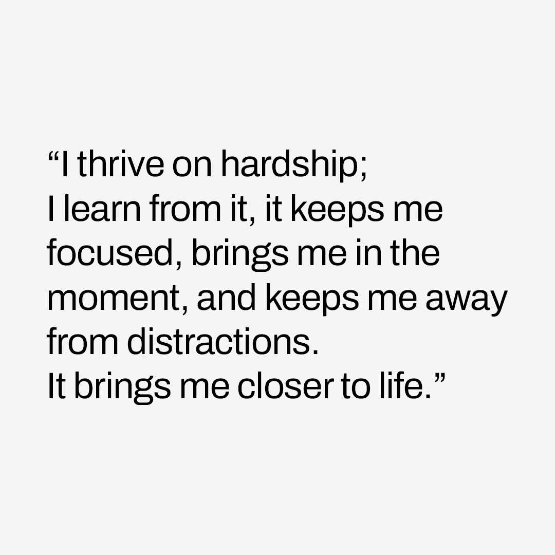 S:I thrive on hardship; I learn from it, it keeps me focused, brings me in the moment, and keeps me away from distractions. It brings me closer to life. But you also have to be conscious that a small accident can have major consequences. This year Nico fell while on the approach and got a cut in his leg. It would have been trivial anywhere else, but there, far from any hospital or doctor, it was significant, and he had to be very careful for the rest of the trip.